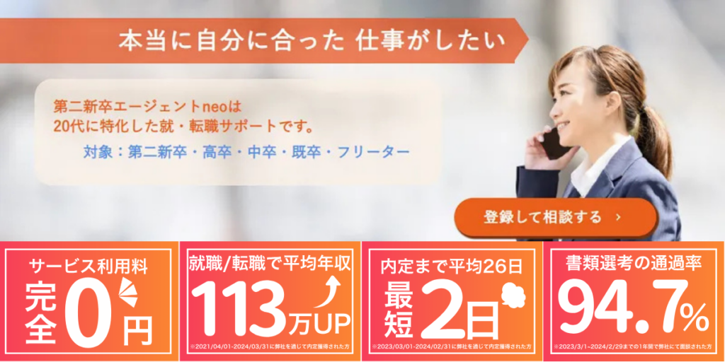 平均26日(最短2日)で内定が出るスピード感なので、ダラダラせず手軽に転職活動を終えられるのもポイントです。 通常、これだけの成果が出るプロのサポートは有料級ですが、ネオキャリアの「若手のキャリアを応援したい!」という想いから完全無料(0円/違約金なども一切なし)でお得に始められます♪